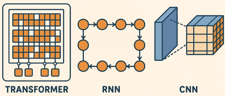 - RNN: xử lý đầu vào theo trình tự, phù hợp với các nhiệm vụ như nhận dạng giọng nói và xử lý ngôn ngữ tự nhiên thời kỳ đầu. Tuy nhiên, chúng gặp khó khăn trong việc ghi nhớ ngữ cảnh dài hạn và không dễ mở rộng quy mô.